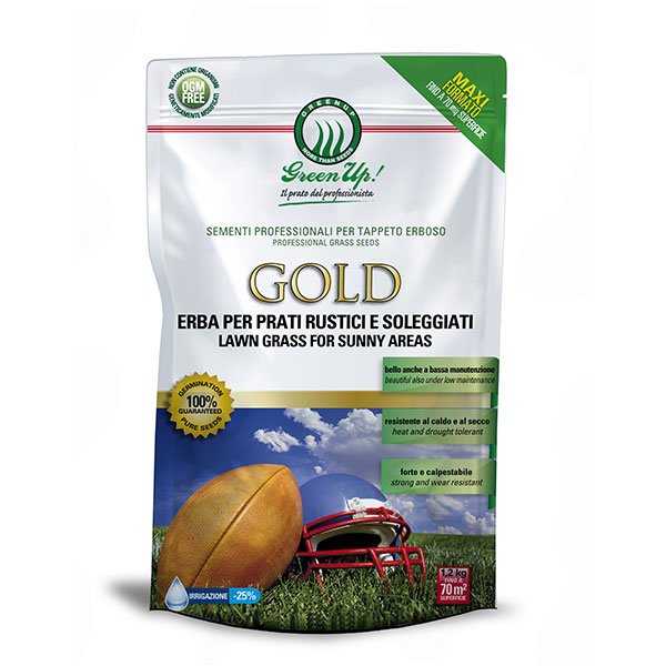 Green Up Gold prato è il miscuglio di festuche arundinacee, loietti inglesi e poe pratensi, di origine americana, per la realizzazione di tappeti erbosi con gradevole aspetto estetico ma, contemporaneamente, rusticità, resistenza e velocità di insediamento. Il suo profondo apparato radicale, assicura una ottima resistenza al calpestio, al caldo ed al secco, anche nei periodi estivi. Permette una riduzione del 25% delle irrigazioni, limita la comparsa delle malattie e delle erbe infestanti. Il colore verde scuro ed il tipico effetto a spazzola, fanno di Gold il prato ideale per i giardini Italiani di pregio a limitata manutenzione.